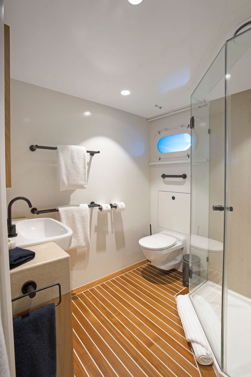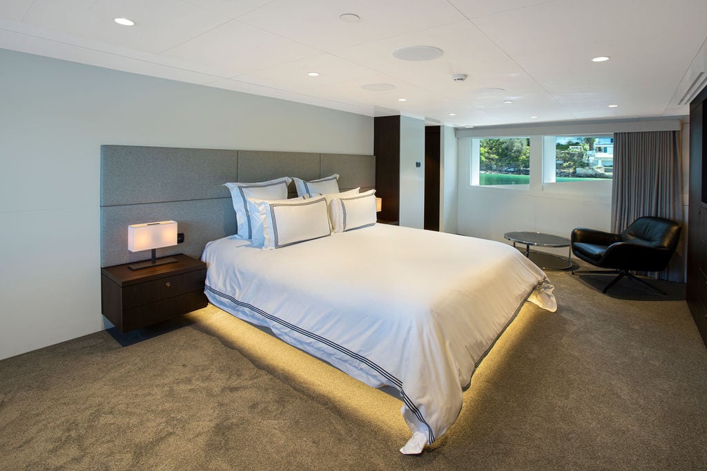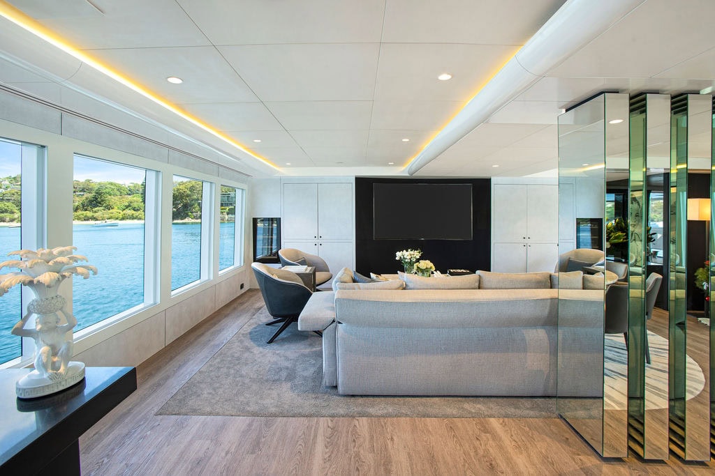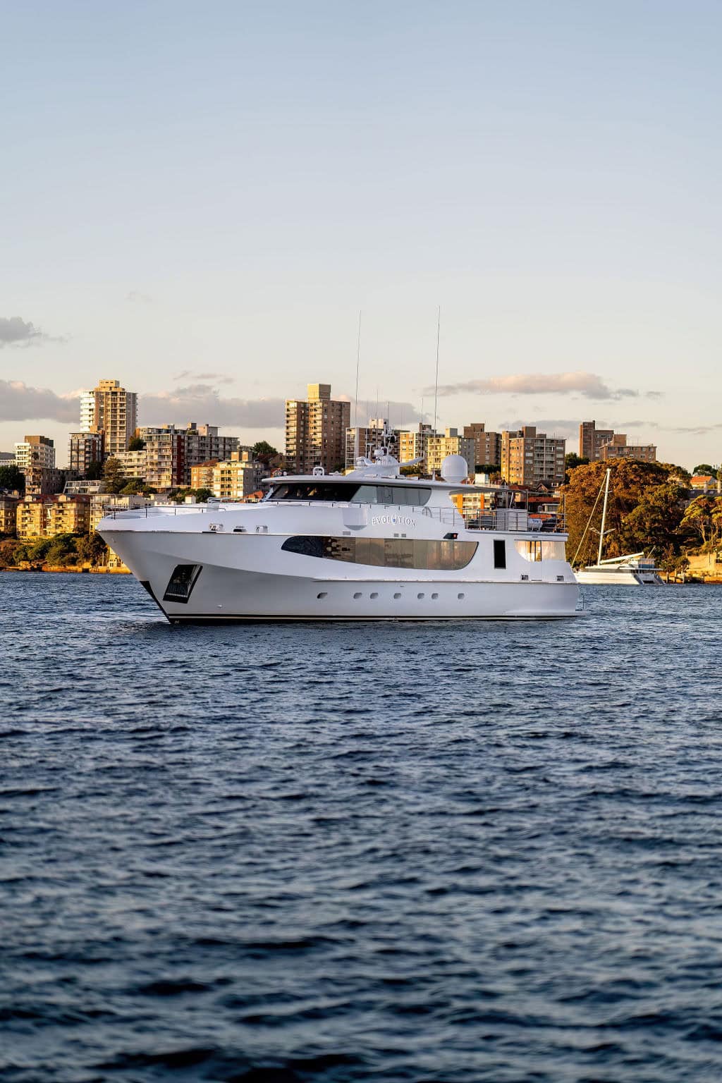 The details on Evolution are carefully considered. Itโs chic interiors and exteriors have a modern style. It features two huge entertaining areas on the main level and upper deck, indoor and outdoor lounging and dining areas, private fully stocked bar, wrap around decks, huge bow sun lounge, large accessible swim platform with all the toys, and four lush cabins. Iโll let the pictures speak for themselves.