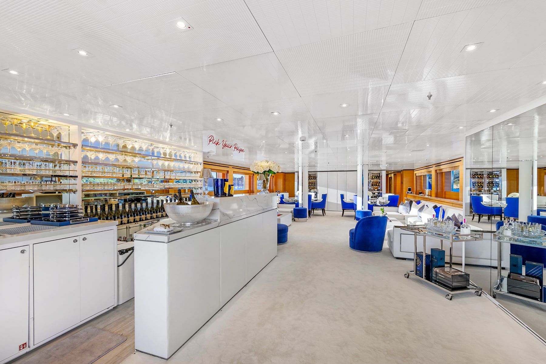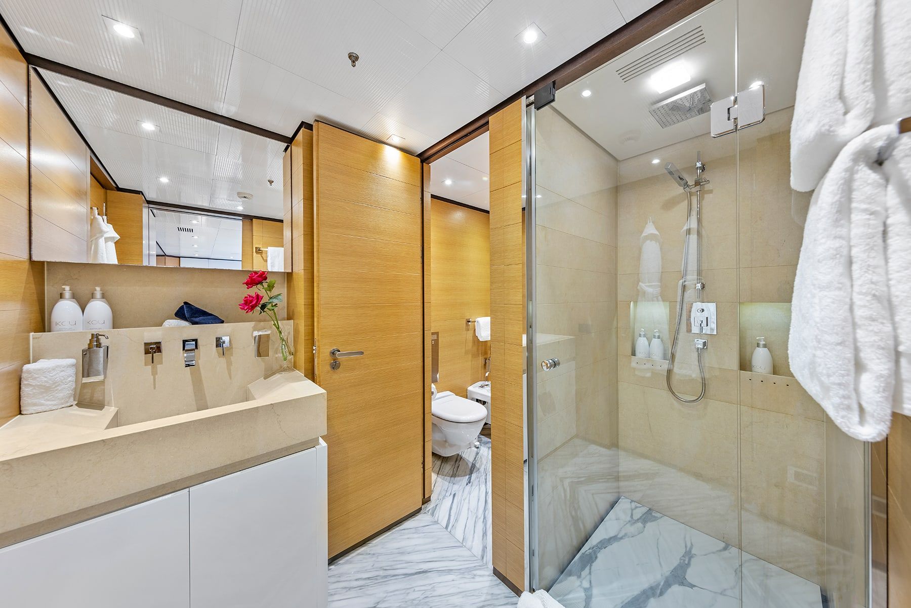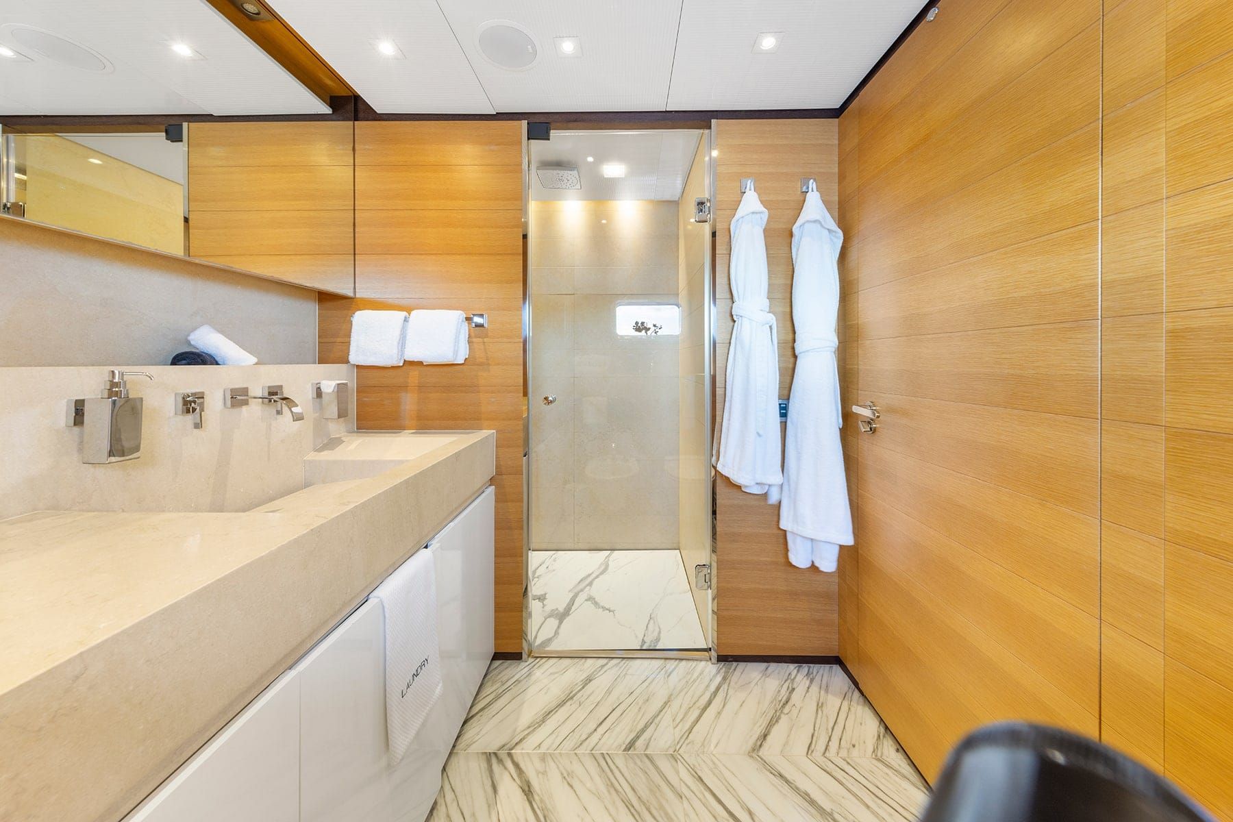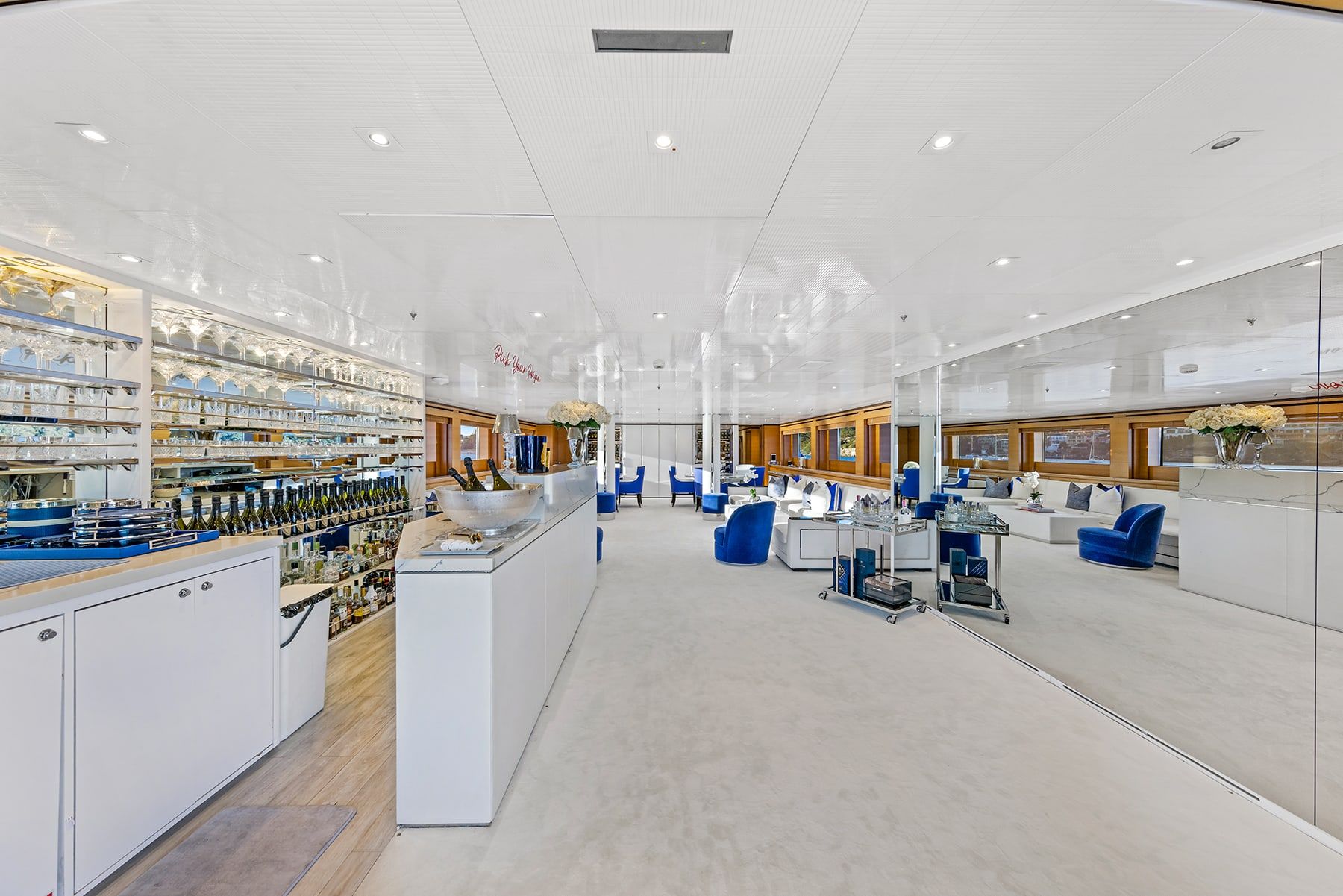 Mischief’s main salon features a large marble bar, with back-lit mirrored wine and glass racks – a theme found in two further wine stores within the cabins. The upper deck sky lounge is yet another bright white space, with curving glass bays inviting you out to the dining and eating areas on the aft-deck. One of the VIP cabins also enjoys this vantage point. The full master suite lies forward on the main deck, with two further large doubles and smaller twins on the lower deck. These twin rooms would be great for children – and with all the entertainment on offer they’ll barely spend any time in their cabins – or get up to Mischief! The twin cabins also convert to super kings in the case there may be a full group of adult couples on board.