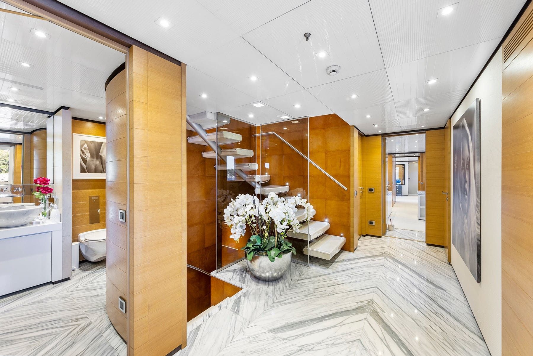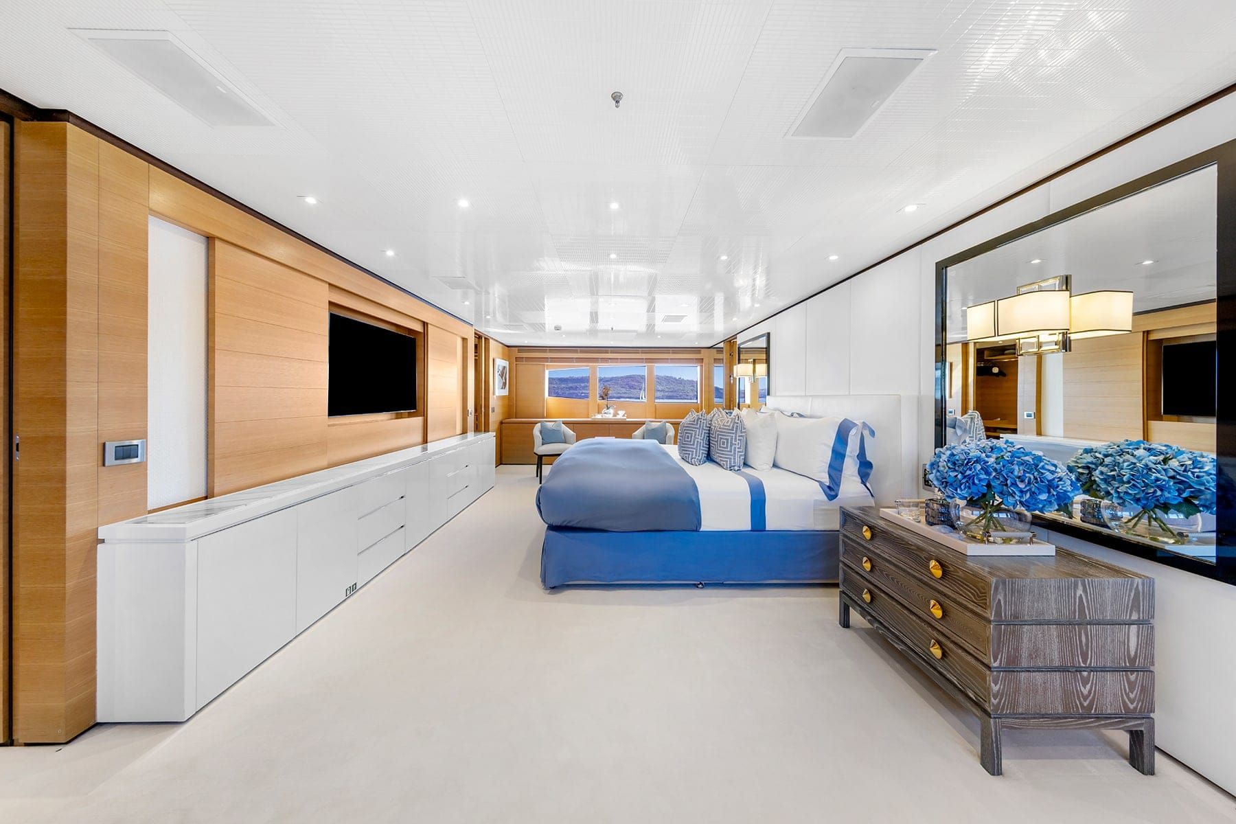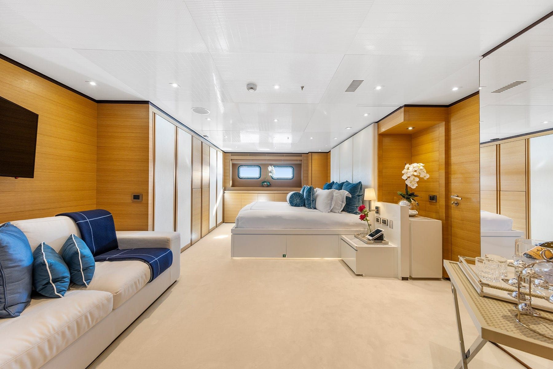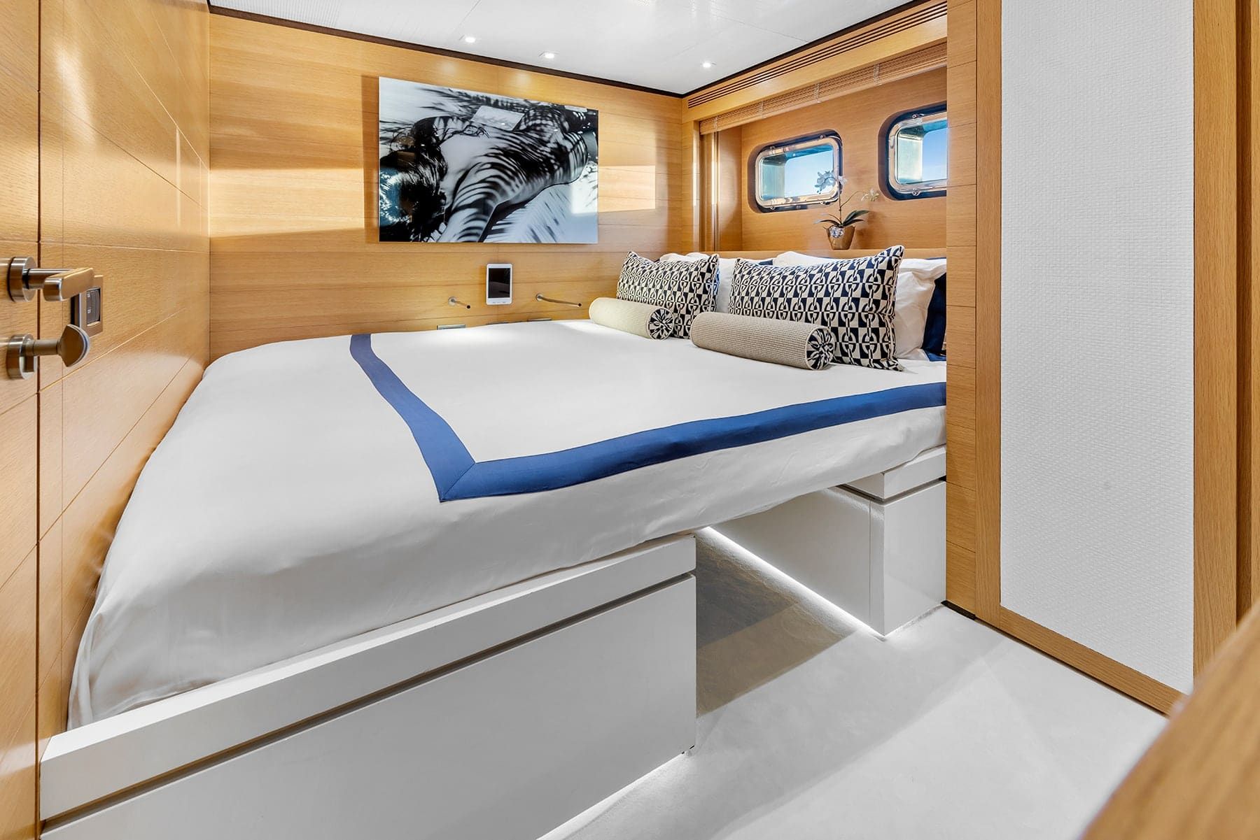 Mischief’s main salon features a large marble bar, with back-lit mirrored wine and glass racks – a theme found in two further wine stores within the cabins. The upper deck sky lounge is yet another bright white space, with curving glass bays inviting you out to the dining and eating areas on the aft-deck. One of the VIP cabins also enjoys this vantage point. The full master suite lies forward on the main deck, with two further large doubles and smaller twins on the lower deck. These twin rooms would be great for children – and with all the entertainment on offer they’ll barely spend any time in their cabins – or get up to Mischief! The twin cabins also convert to super kings in the case there may be a full group of adult couples on board.