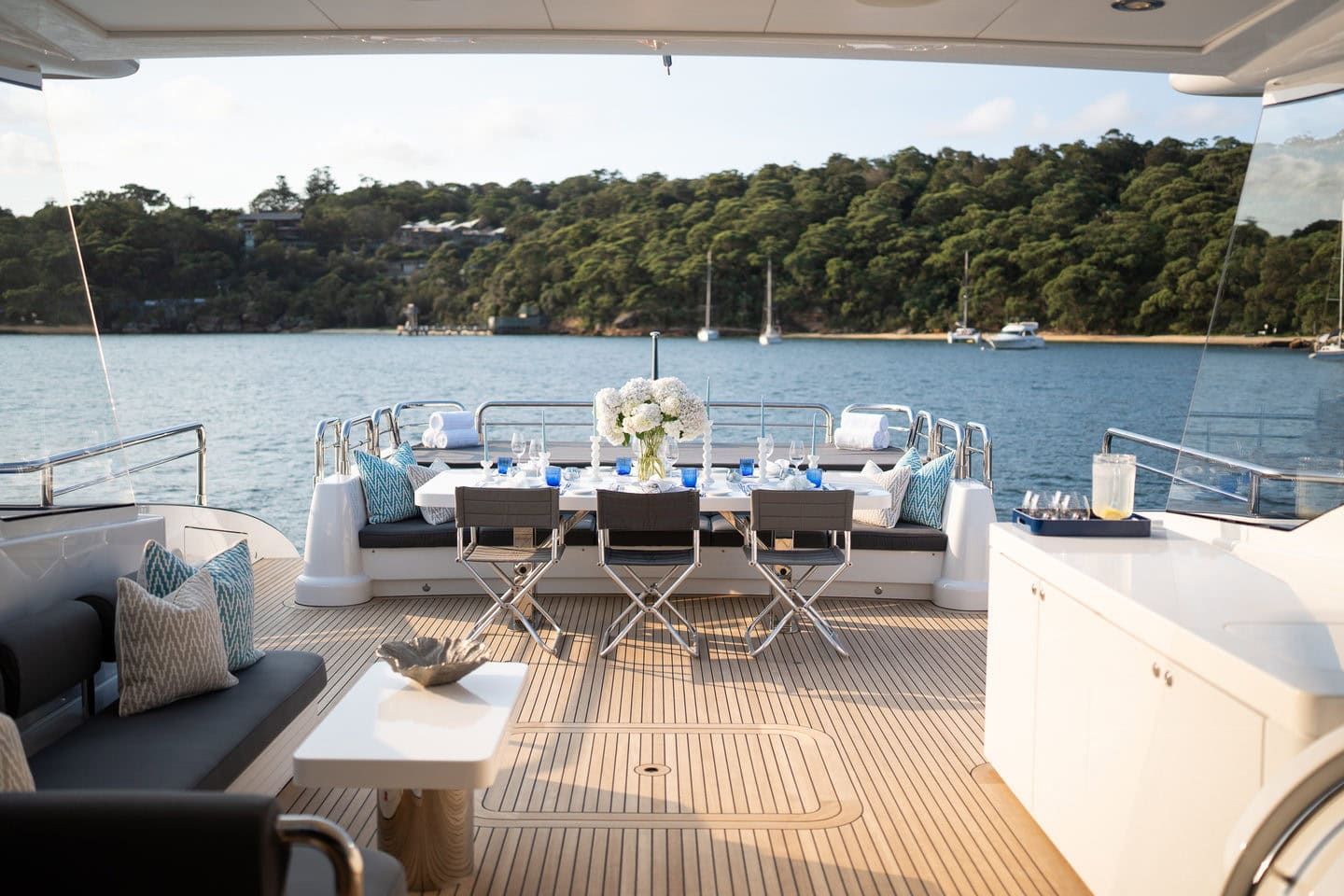My personal favourite is the bow features a lounge and table sheltered by a large shade umbrella, large saloon with TV and seating which flows out to the aft deck with outdoor dining table and another TV available for presentations. For those keen swimmers, Quantum has a hydraulic lowering swimming platform allowing guests to safety swim in the harbour.