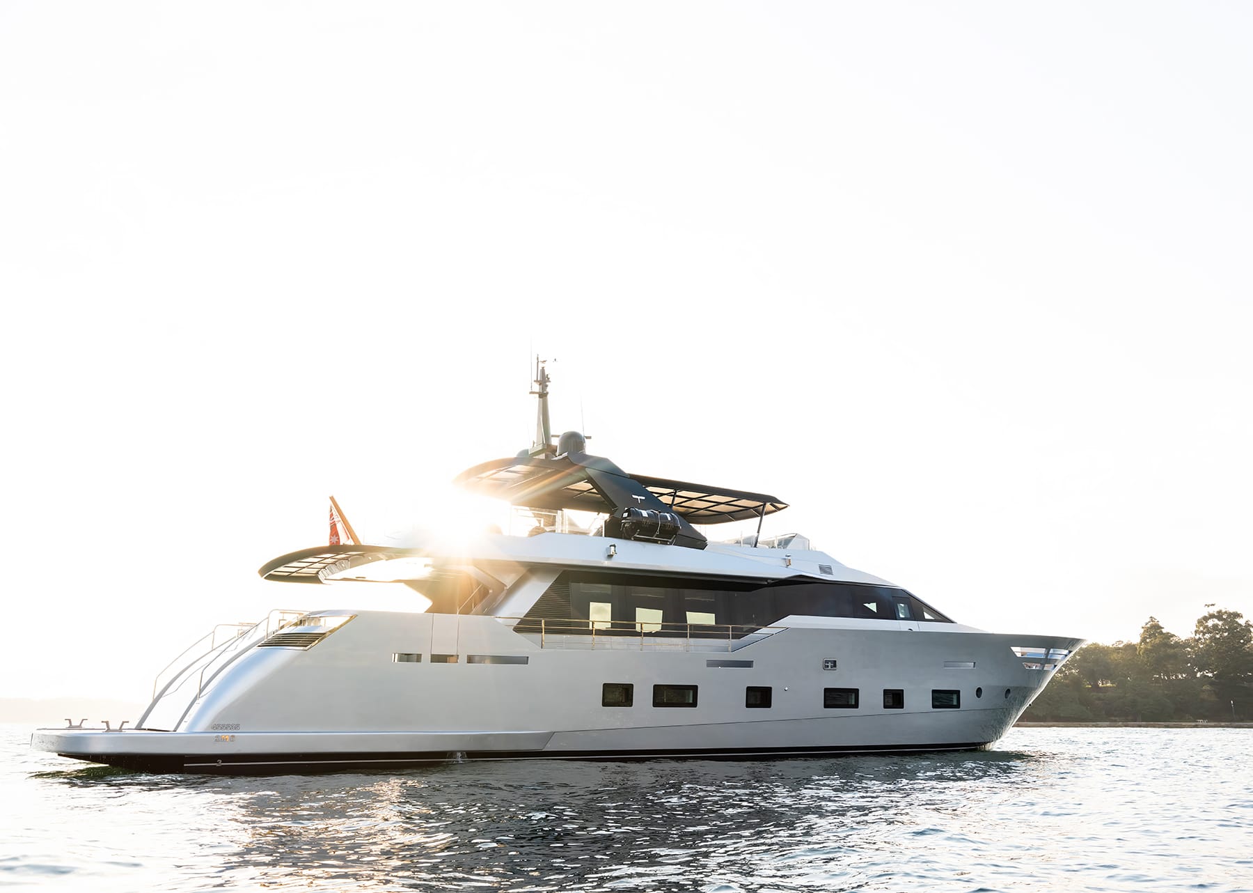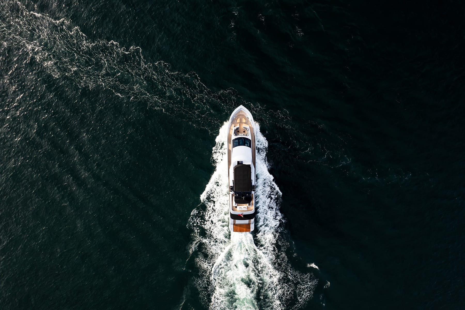 As you board, youโll see a spacious external dining area and indoor saloon with large windows to take in the views. The wrap around decks will lead you to the incredible bow which has been transformed to a large table and lounge set perfect for soaking in the sun. Upstairs, the flybridge is vast, with a private bar, and comfortable lounges and seating.